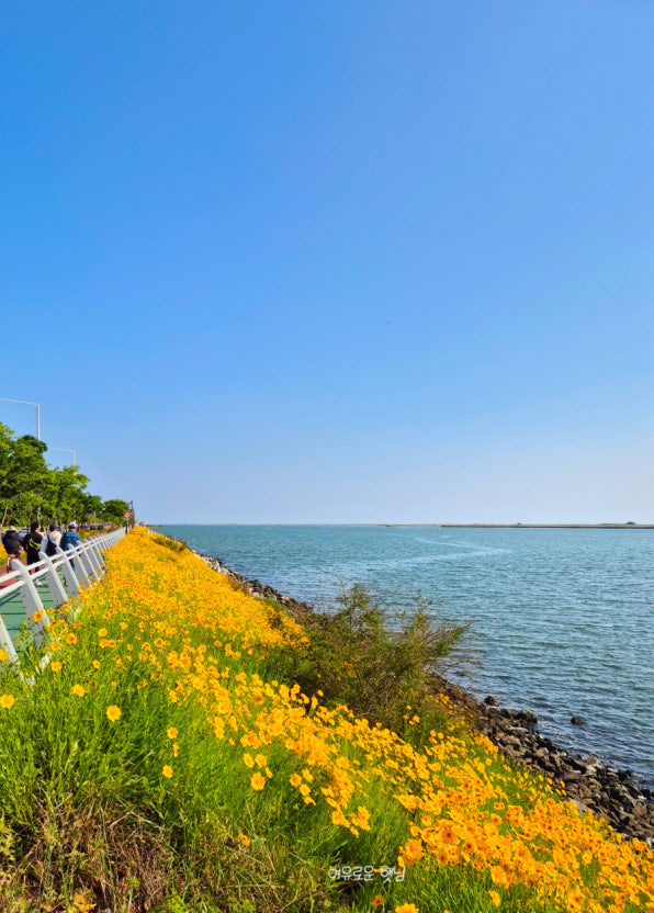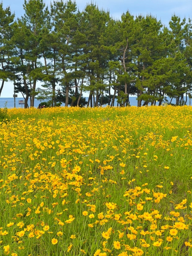바다와 꽃이 어우러지는 이색적인 풍경. 해변 산책로를 따라 피어나는 금계국은 인생샷 명소로 인기입니다.