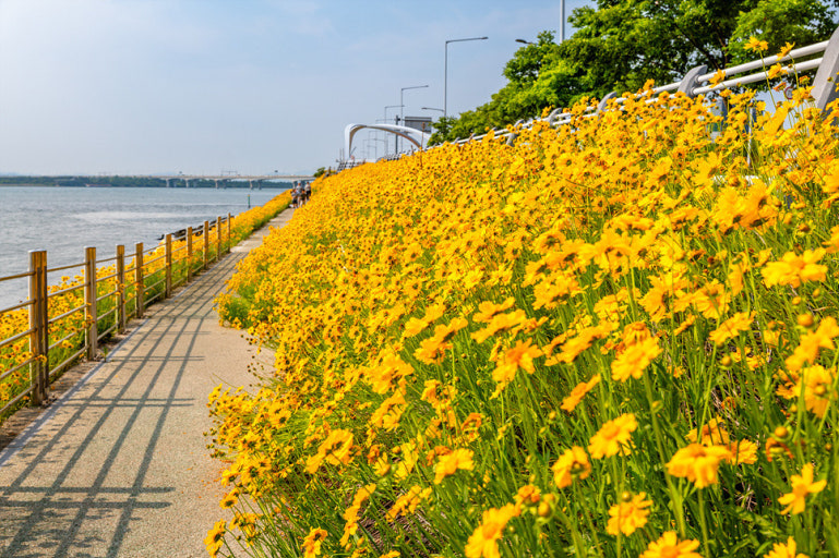 넓은 강변을 따라 금계국이 군락을 이루며 피어나는 곳으로, 자전거 도로와 함께 어우러진 풍경이 인상적인 명소입니다.