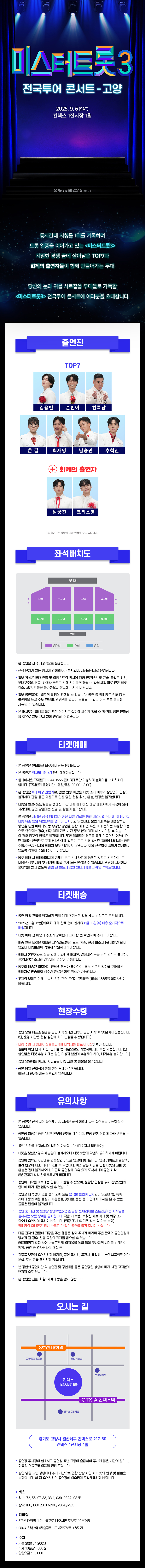 이번 고양 공연에는 미스터트롯3 TOP7 멤버들인 김용빈, 손빈아, 천록담, 최재명, 추혁진, 춘길, 남승민(출연 조율 중) 외에도 남궁진, 유지우, 크리스영 등 화제의 출연자들이 함께 무대에 오릅니다.: