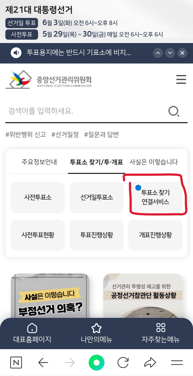 - 상단 메뉴 → 선거정보 → 내 투표소 찾기 클릭